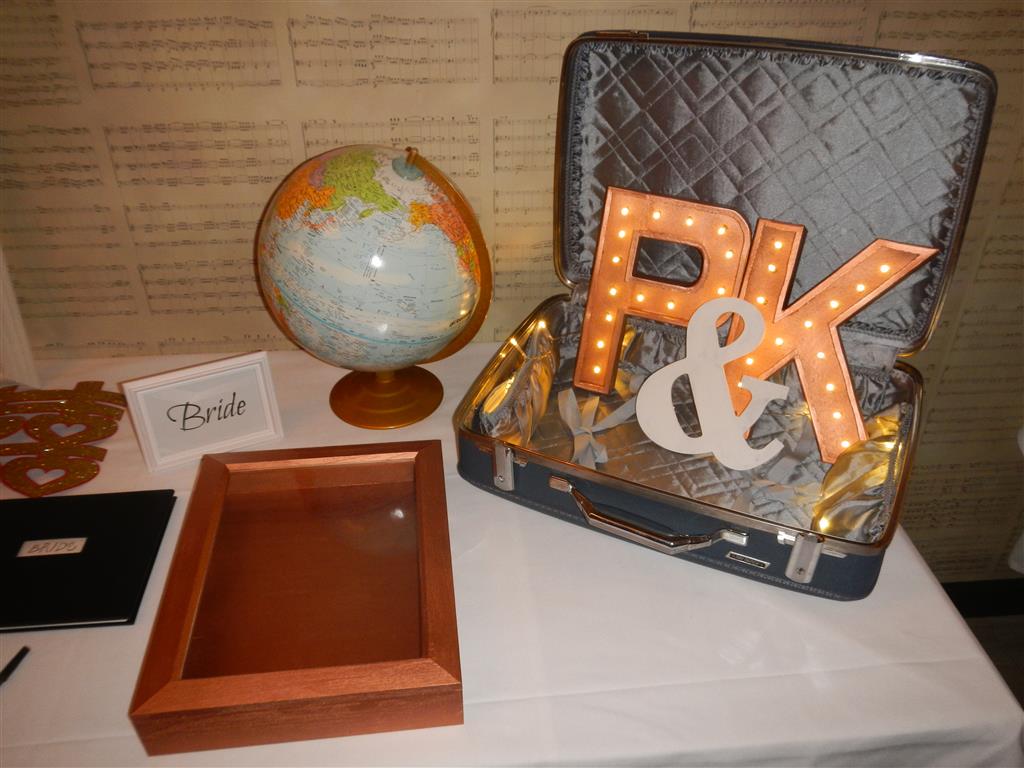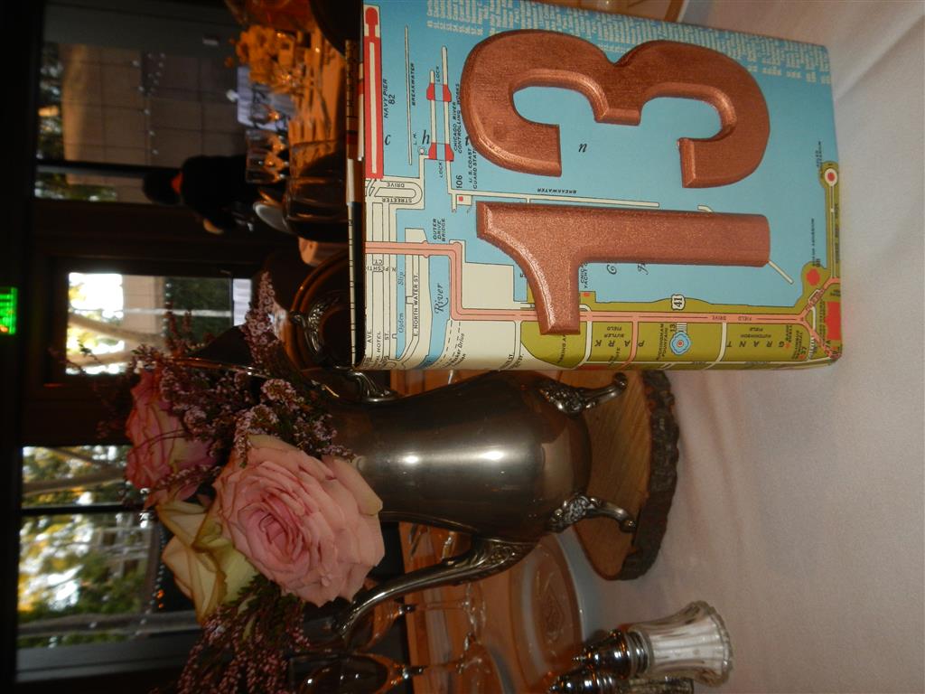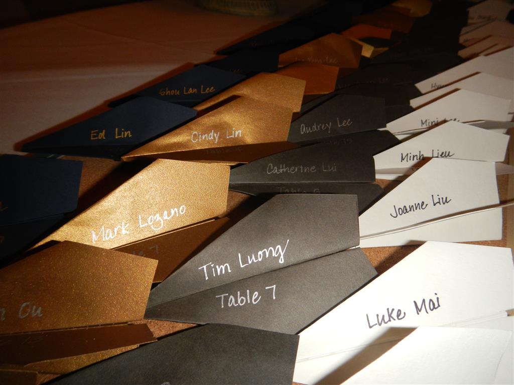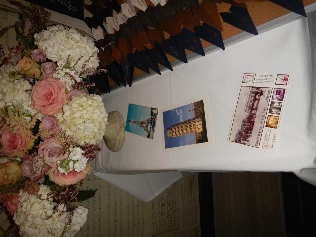 (The place cards were little folded airplanes with their name and table on it; each guest takes the pin holding it and places it on their favorite city on the world map)